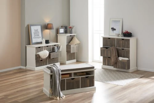 En MDF, bouleau massif. Revêtement : coton, polypropylène, polyester. Garnissage : mousse polyuréthane. l102 x H50 x P39 cm