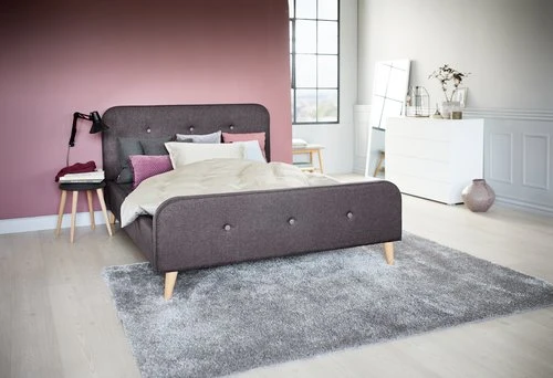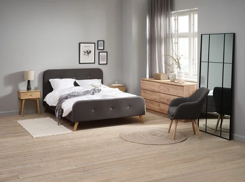 Cadre : contreplaqué, aluminium, plastique ABS. Garnissage : mousse polyuréthane. Revêtement : polyester. Pieds : bois de caoutchouc massif. Excl. sommier et matelas. Pour matelas 140×200 cm, l156 x L216 x H101 cm