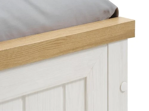 En MDF mélaminé, panneau de particules, placage feuille, hêtre massif. Pour matelas tapissiers, à ressorts ou en mousse. Couchage : 140×200 cm. Excl. sommier et matelas. l150 x L210 x H91 cm