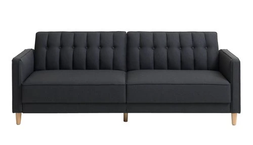 En contreplaqué, acier et bois de caoutchouc massif. Garnissage : mousse polyester (30 kg/m³). Revêtement : polyester. Couchage : 112×200 cm. 2 personnes. l222 x H86 x P86 cm