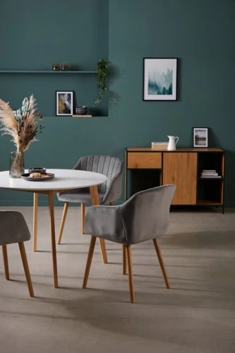 En contreplaqué, acier. Garnissage : mousse polyuréthane (22/25 kg/m³). Revêtement : polyester. Pieds : bois de caoutchouc massif. l59 x H82 x P59 cm