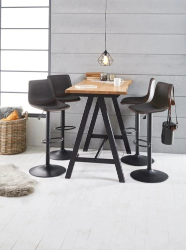 Cadre : contreplaqué. Garnissage : mousse polyuréthane (24/25 kg/m³). Revêtement : polyuréthane. Piètement : acier, finition époxy. Hauteur ajustable. l48 x L45 x H89-111 x P48 cm
