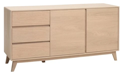 Face avant, partie supérieure et inférieure, côtés, 1 étagère : placage chêne, panneau de particules. Pieds : chêne massif. 2 portes soft-close, 3 tiroirs soft-close avec glissières d’extension complète. l160 x H80 x P45 cm