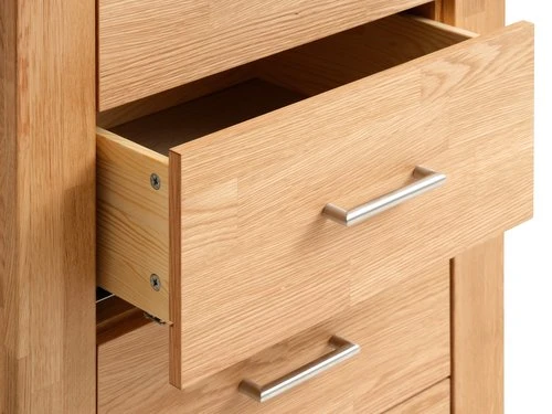 Chêne massif et placage chêne. Tiroirs soft-close. l73 x H98 x P50 cm