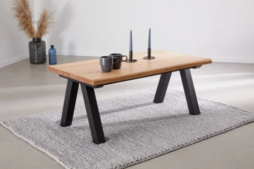 Plateau : panneau de particules plaqué chêne, chêne massif. Pieds : pin/bouleau massif revêtement MDF4. l60 x L110 x H45 cm