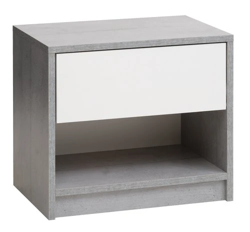 En panneau de particules. Surface : mélaminé. Pieds : plastique. 1 tiroir. l52 x H46 x P35 cm