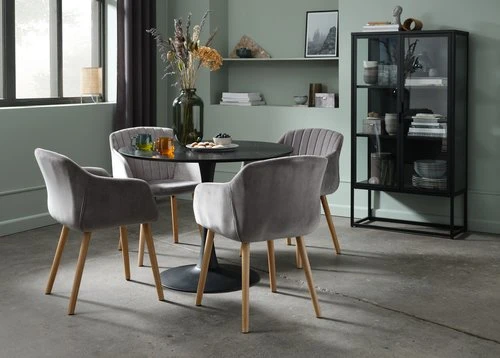 Plateau : MDF, placage frêne. Structure : béton, acier, polypropylène. Pieds : acier. Vernis. Ø100 x H75 cm